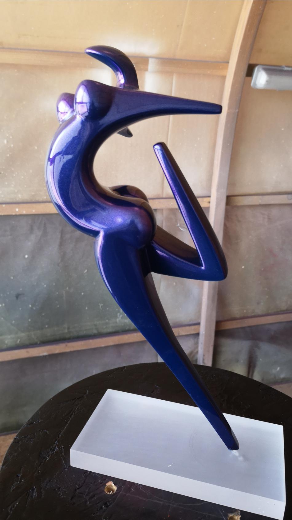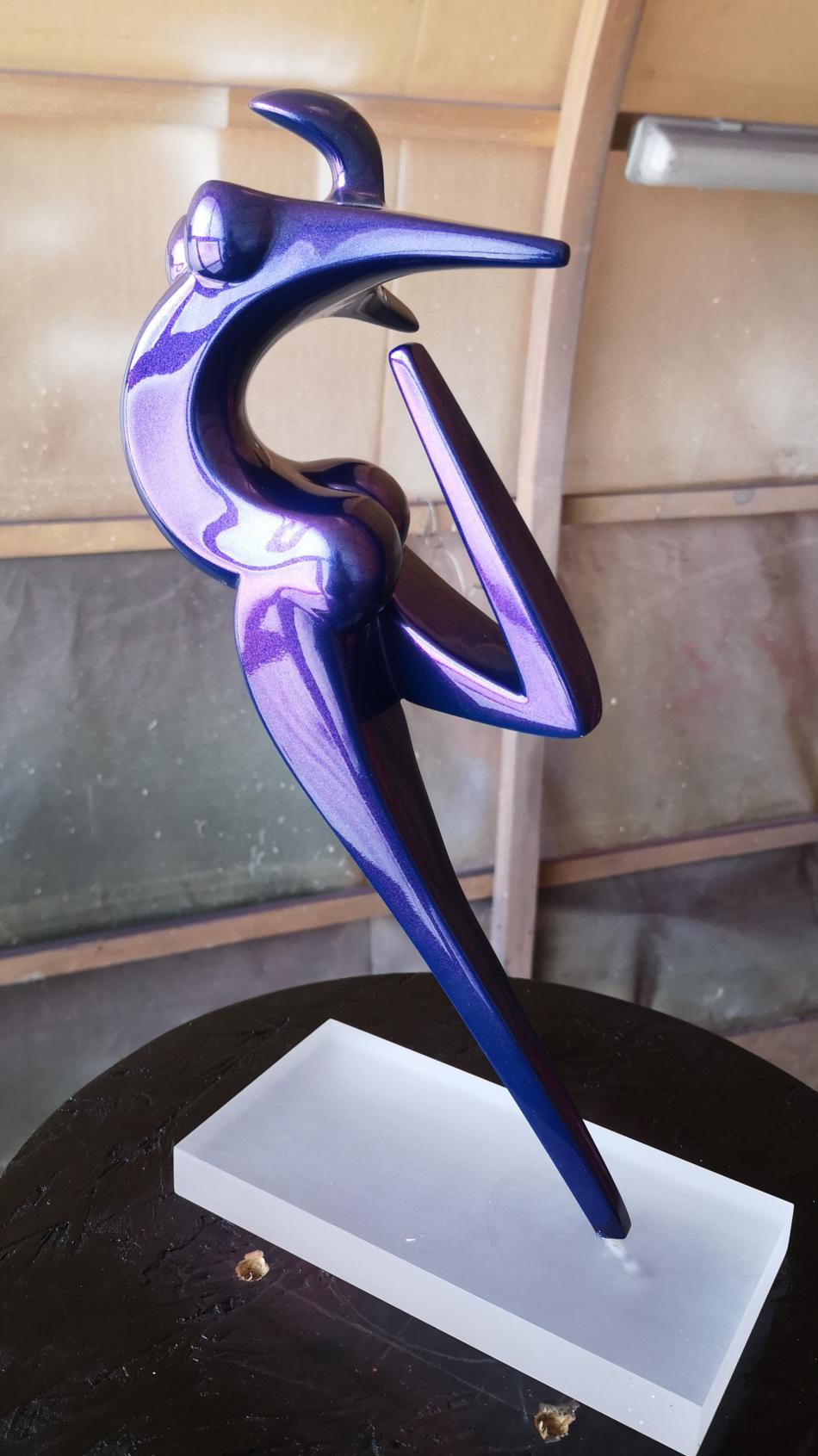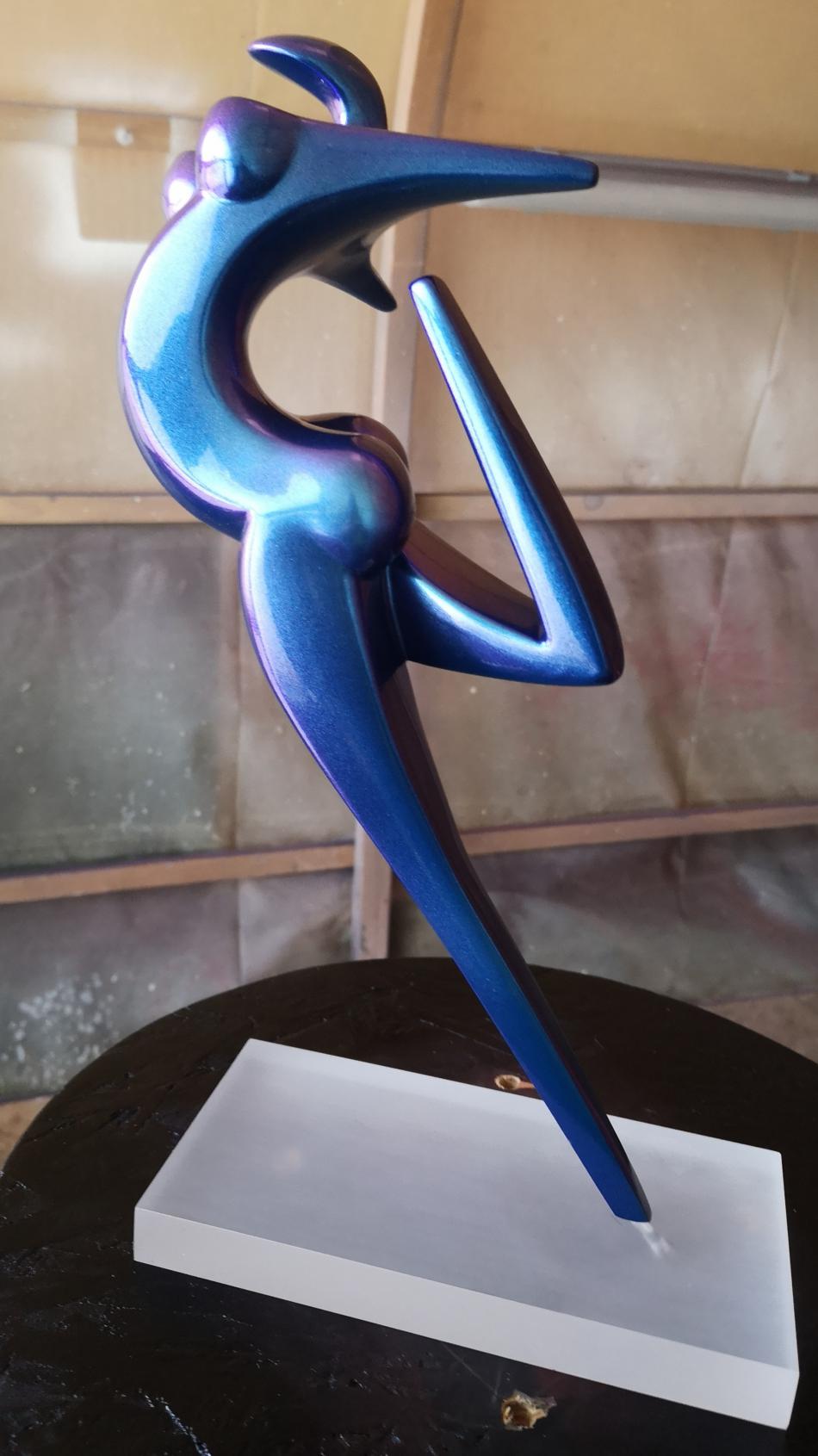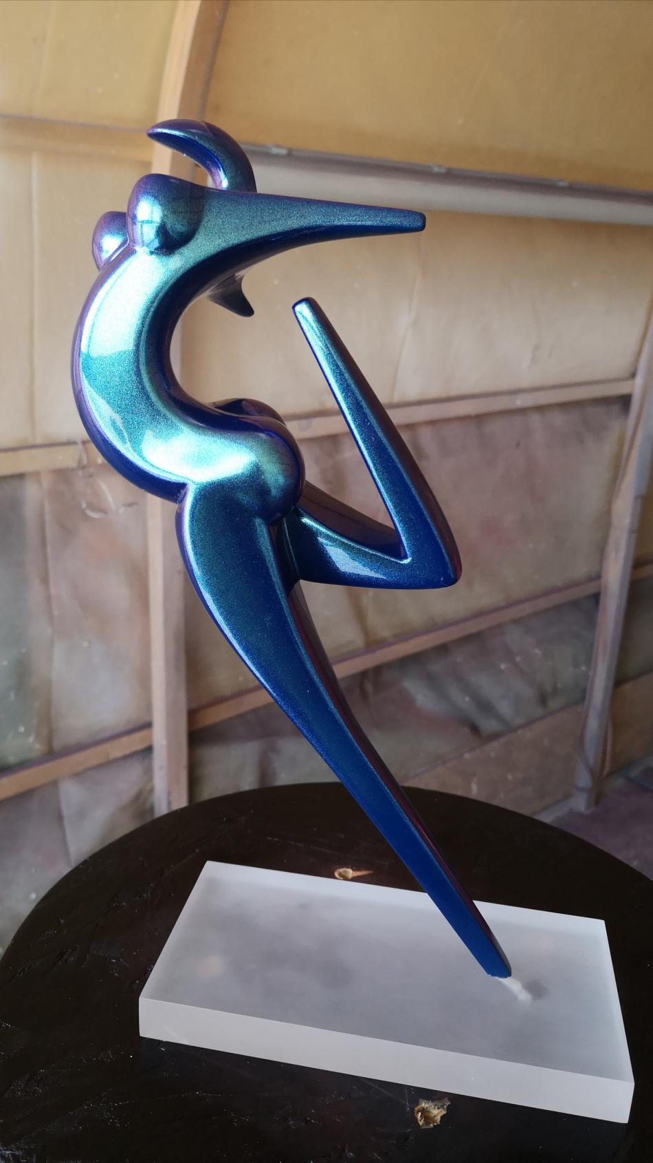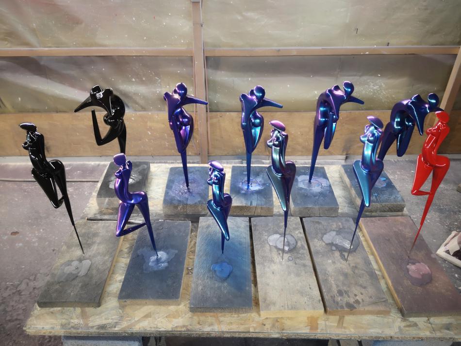 Art Factory vient de réaliser 2 mini séries de sculpture de petite taille (30cm) en résine époxy de coulée. Les sculptures sont coulées avec une résine époxy résistante, la finition a été faite avec apprêt acrylique recouvert d'une teinte à revernir de type caméléon (chromalusion). Ces teintes sont chargées de prismes qui font varier la couleur en fonction de l'exposition à la lumière. Elles sont dites à effet 2, 3 et 4 couleurs. Par exemple, Turquoise/Violet/Vert/Rouge ou Bleu/Violet, etc. La teinte est ensuite recouverte de 3 couches de vernis PU à haute brillance.