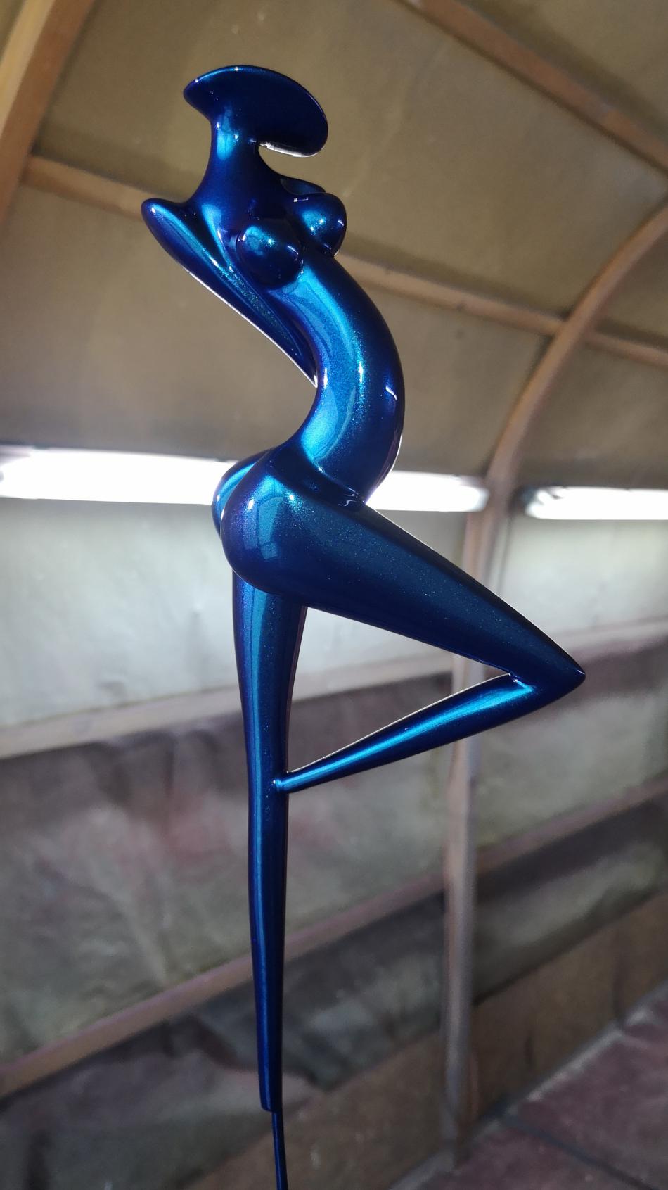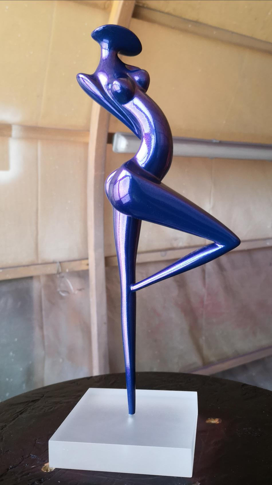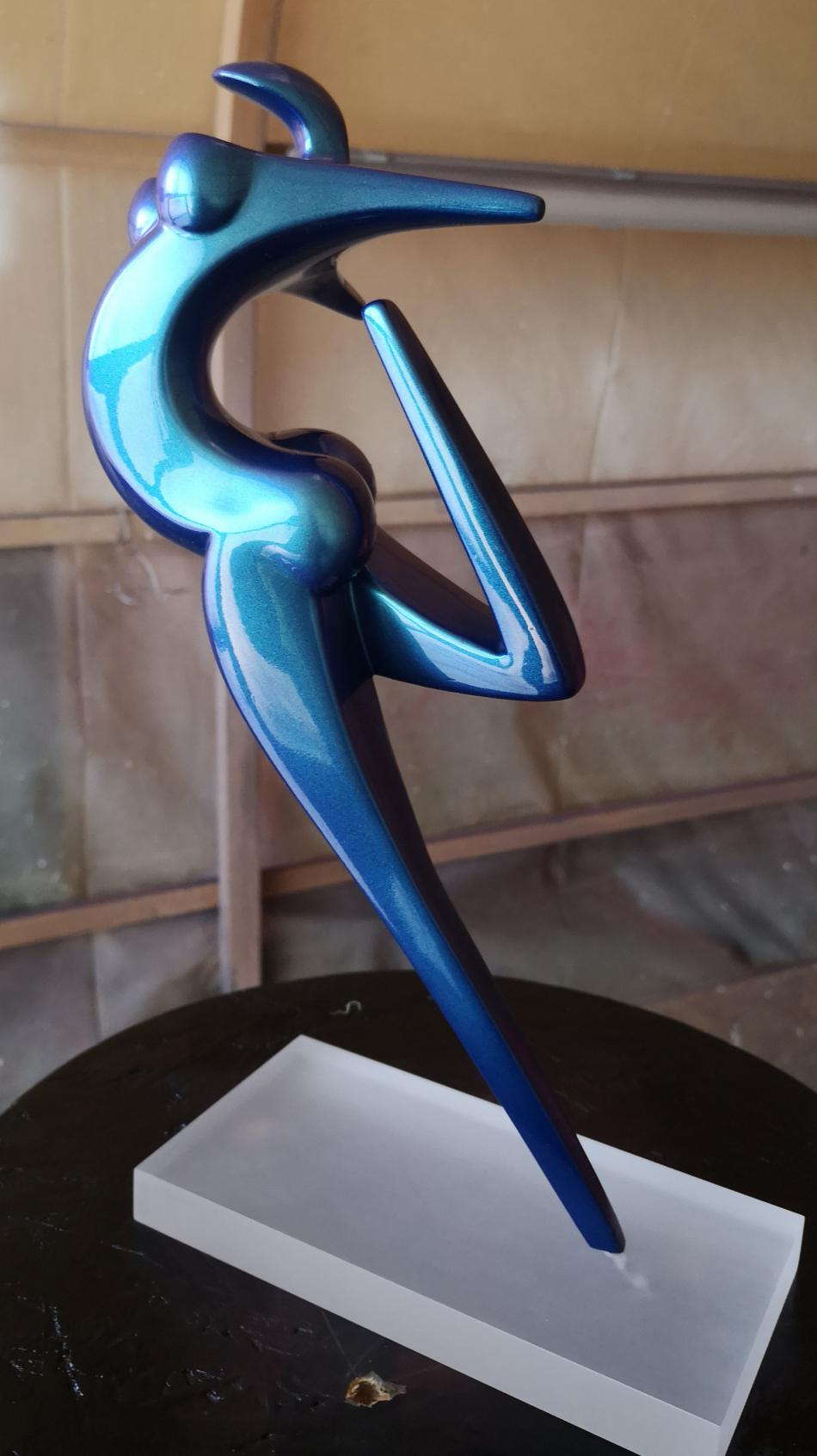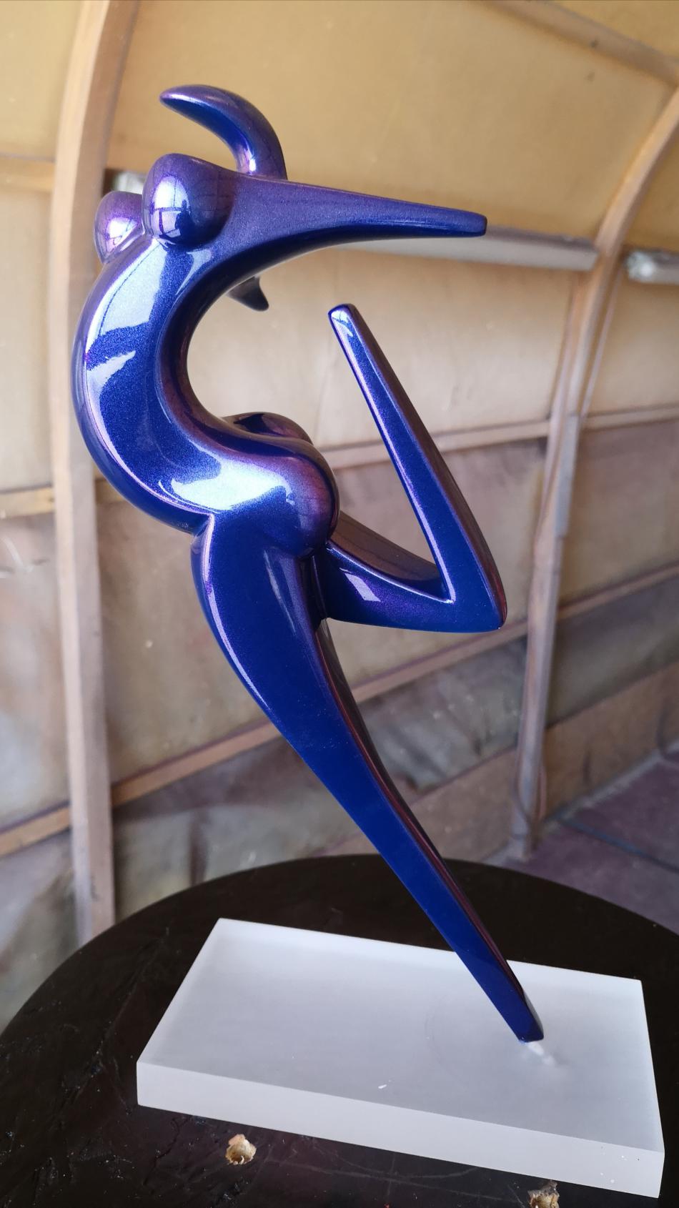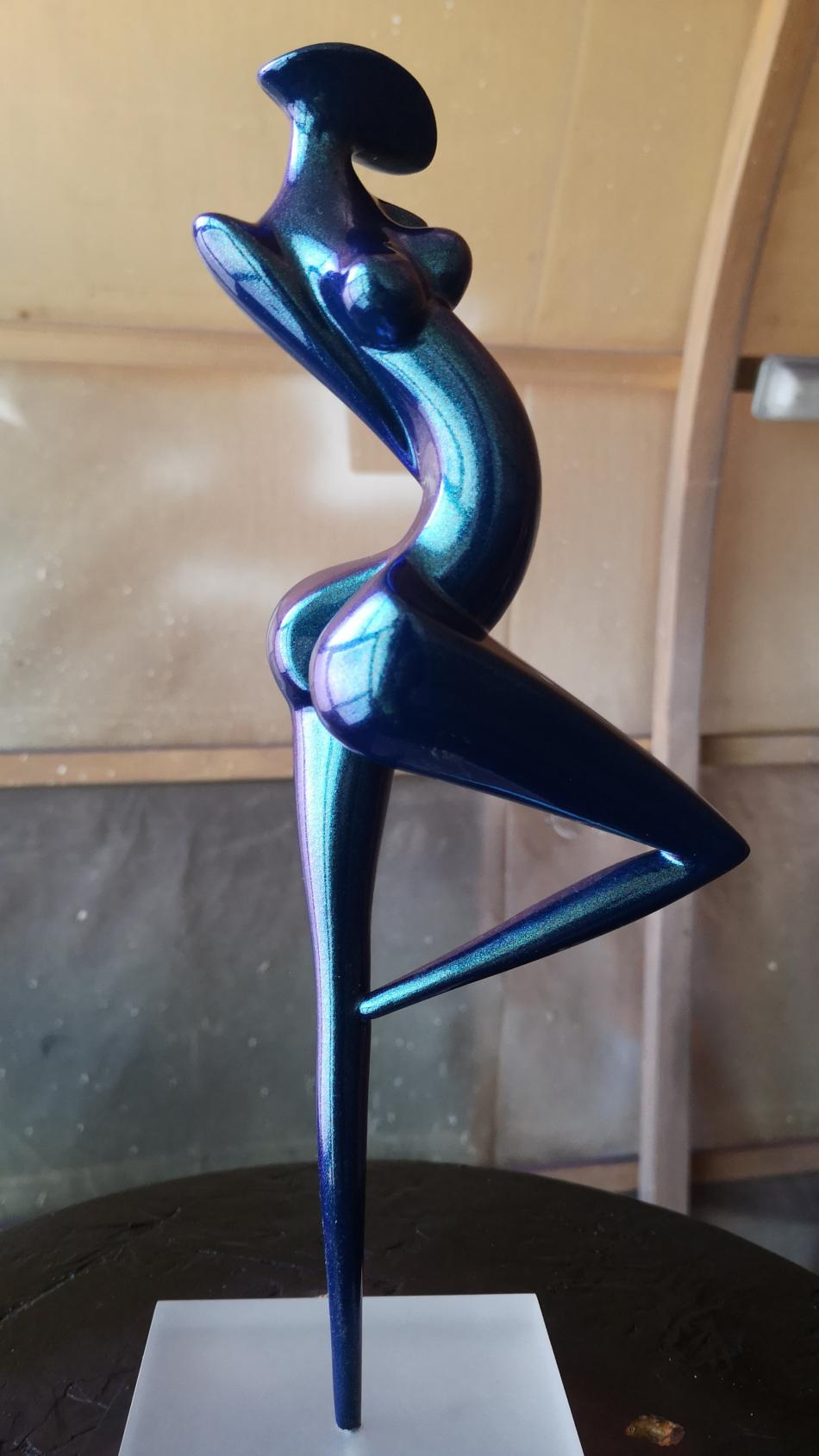 Art Factory vient de réaliser 2 mini séries de sculpture de petite taille (30cm) en résine époxy de coulée. Les sculptures sont coulées avec une résine époxy résistante, la finition a été faite avec apprêt acrylique recouvert d'une teinte à revernir de type caméléon (chromalusion). Ces teintes sont chargées de prismes qui font varier la couleur en fonction de l'exposition à la lumière. Elles sont dites à effet 2, 3 et 4 couleurs. Par exemple, Turquoise/Violet/Vert/Rouge ou Bleu/Violet, etc. La teinte est ensuite recouverte de 3 couches de vernis PU à haute brillance.